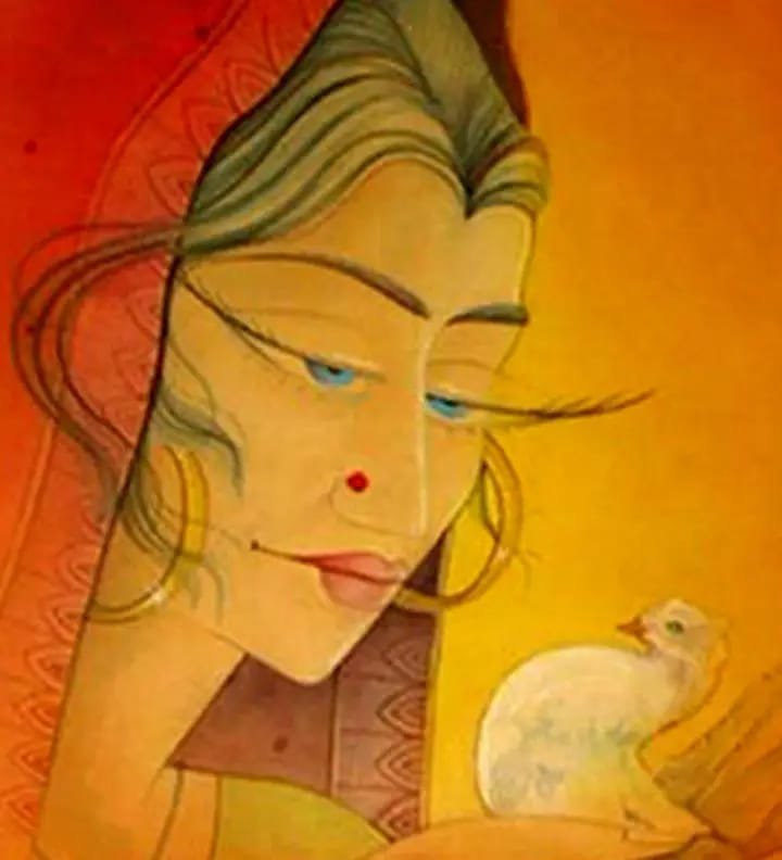 This captivating watercolor painting portrays a serene and enigmatic woman, her gaze drawn to a small bird perched on her hand. The artist has skillfully captured the delicate details of her features, from the intricate patterns on her attire to the subtle expression in her eyes. The warm, earthy tones of the painting create a sense of warmth and intimacy, inviting the viewer to connect with the woman’s inner world.