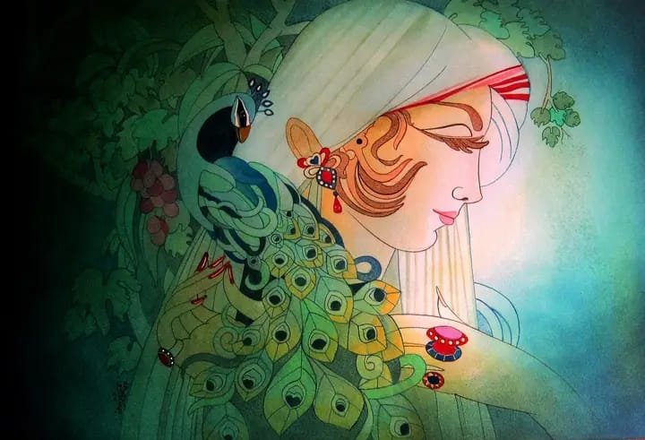 This enchanting watercolor painting depicts a serene woman with flowing hair, adorned with intricate patterns and a peacock perched on her shoulder. The artist’s skillful use of color and shading creates a dreamlike atmosphere, with the vibrant hues of the peacock contrasting beautifully with the soft tones of the woman’s face. The delicate details, from the intricate patterns on her clothing to the lifelike depiction of the peacock, are rendered with precision and artistry.
