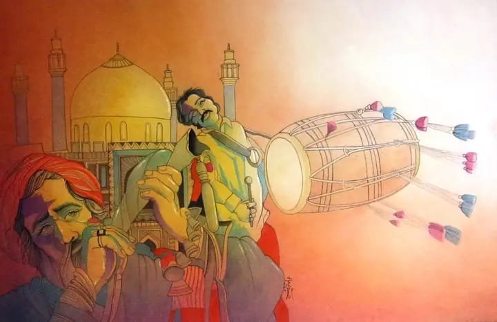 This captivating artwork is a stunning portrayal of a traditional Qawwali performance, capturing the energy and spirituality of this beloved musical tradition. The artist’s skillful use of color and line creates a mesmerizing scene that is both dynamic and evocative. The painting’s warm and inviting color palette evokes a sense of warmth and joy, while the intricate details in the musicians’ attire and the instruments showcase the rich cultural heritage of this musical form.