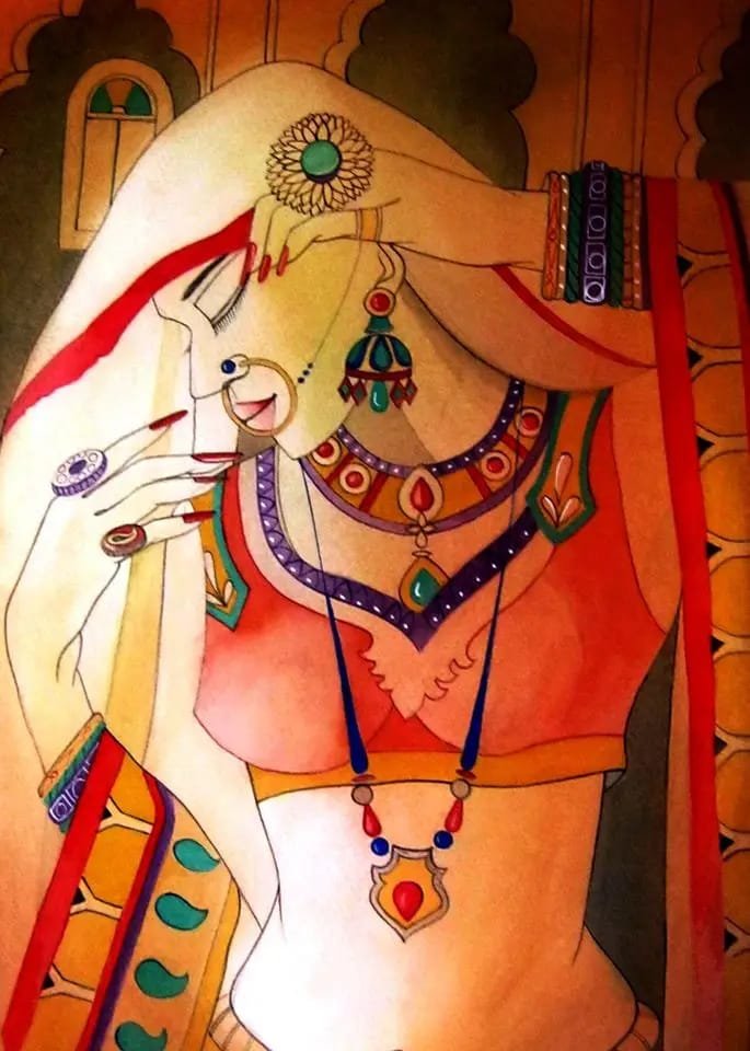 • Intricate Detail: The artist has meticulously captured the intricate details of the woman’s attire and jewelry, showcasing the rich cultural heritage of Rajasthan.