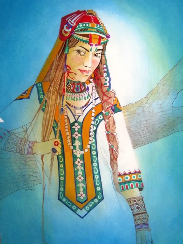 This captivating watercolor painting portrays a stunning woman, adorned in traditional attire, exuding an air of grace and elegance. The artist has skillfully captured the intricate details of her clothing, from the vibrant colors to the delicate embroidery. Her expressive eyes and gentle smile convey a sense of warmth and serenity. The backdrop of a serene landscape adds to the overall beauty of the painting.