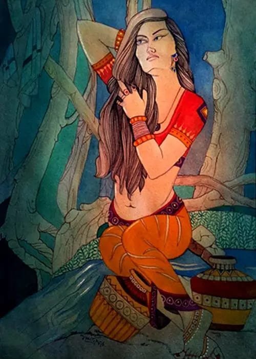This captivating watercolor painting portrays a serene and contemplative woman, lost in a moment of self-care. The artist has skillfully captured the delicate details of her features, from the intricate patterns on her attire to the subtle expression in her eyes. The lush, verdant surroundings, with the gentle flow of water, create a peaceful and idyllic atmosphere.