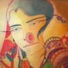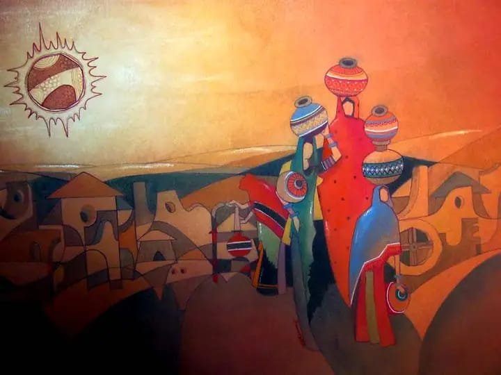 This vibrant and evocative painting captures the essence of rural life, depicting a group of women carrying water pots against a backdrop of a sun-drenched landscape. The warm, earthy tones of the painting evoke a sense of warmth and tranquility, while the bold, stylized figures add a touch of dynamism and energy.