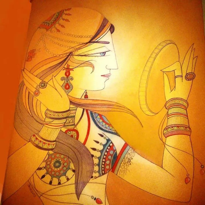 The woman is depicted holding a mirror, symbolizing self-reflection and introspection. The soft lighting and the muted color palette create a peaceful and contemplative atmosphere. The artist’s skillful use of pen and ink creates a sense of depth and dimension, drawing the viewer into this serene scene.