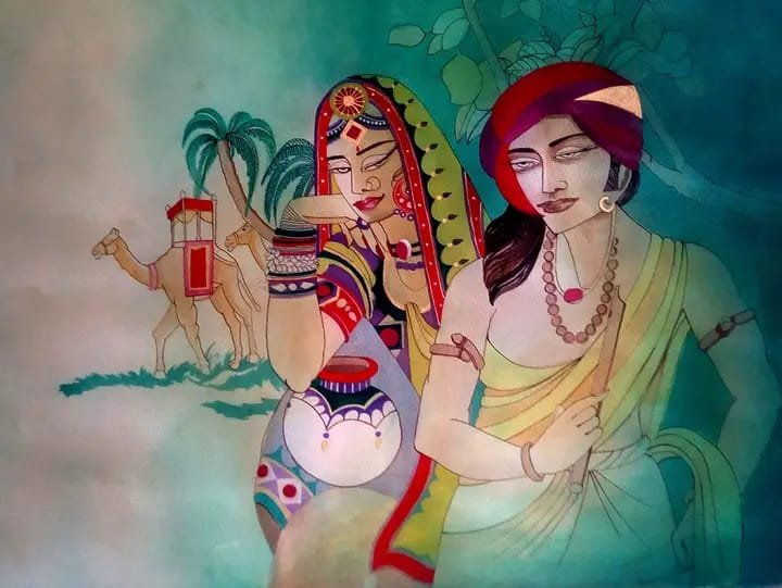This vibrant painting captures a glimpse of life in a bygone era. Two women, adorned in traditional attire, stand amidst a picturesque landscape. The intricate details of their clothing and jewelry, along with the vibrant colors used, create a sense of authenticity and nostalgia. The artist’s masterful use of light and shadow adds depth and dimension to the scene, drawing the viewer in to appreciate the beauty of this timeless artwork.